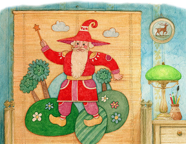 Жила-была маленькая девочка. Были у неё мама и папа. Мама любила покупать дочке книги со сказками и красивыми иллюстрациями. Она долго ходила по рядам книжного магазина и выбирала самые лучшие, самые красивые издания. А папа любил читать эти книги девочке и показывать ей страницы с картинками. А девочка любила рассматривать картинки и слушать сказки. Каждый вечер папа брал из шкафа книгу, усаживался на стул рядом с дочкиной кроватью и читал ей на ночь очередную сказку с выражением и по ролям. Если на странице была картинка, он прерывался и показывал её девочке. А та приподнималась на локте в кровати, долго смотрела на картинку, а потом говорила: «всё папа, читай, пожалуйста, дальше». Но однажды случилось так, что мама не успела купить новую книгу, а все, что у них были, оказались прочитанными. В тот вечер папа задумчиво обвёл глазами комнату. Над дочкиной кроваткой висел соломенный коврик с аппликацией из кусочков фетра. Маленький человечек с добрыми глазами и густой седой бородой шёл по лесной полянке и держал в руке палочку со звездочкой. На нём была широкополая шляпа, красный подпоясанный кафтан, шаровары и деревянные туфли. С минуту папа смотрел на человечка, а потом стал рассказывать