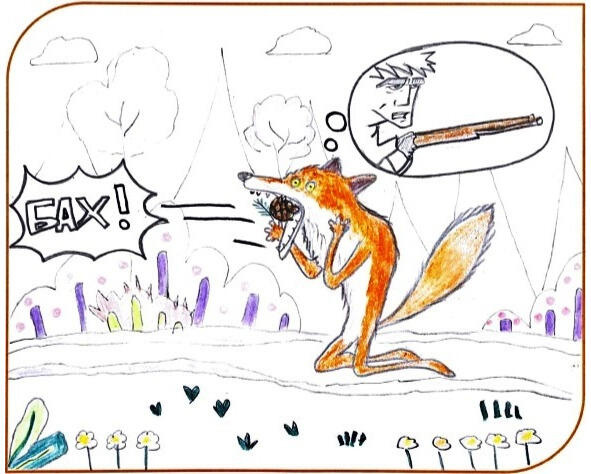 Der Rotschwanz lauerte in der Nähe des Hasenhauses und erwartete, eine der Sensen zu fangen. Burun war nicht ratlos: Er holte eine Schleuder aus seinem Portfolio und steckte einen Tannenzapfen hinein. Er zielte und feuerte. Die Beule, die von der nächsten Kiefer abgeprallt war, flog direkt in den roten Mund. Zusammen mit einem Kloß in Fox «Kehle blieben alle Wörter stecken, die dann zu einem Geräusch verschmolzen, das an das Summen eines Bienenhauses erinnerte. Der Fuchs verstand nicht, was in diesem ruhigen Wald passiert war, und zeigte auf der Flucht ein schreckliches Bild: einen bösen Jäger mit einer Doppelkanone, der erneut zielte und aus dem zweiten Lauf schießen wollte. Burun hatte es nicht, aber es lagen viele Tannenzapfen herum, und der kleine Jäger schickte mehrere von ihnen nach Lisa.