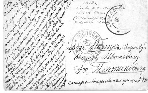 В Полоцке. Слева Мария Даниловна. Платанович и её дочь Саша с куклой. Фото 1912 г. Саше 6 лет. На обороте письмо из Шклова в Полоцк мужу Федору Ивановичу от 21.07.1912