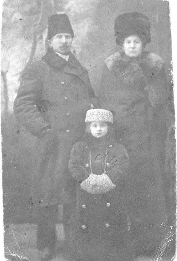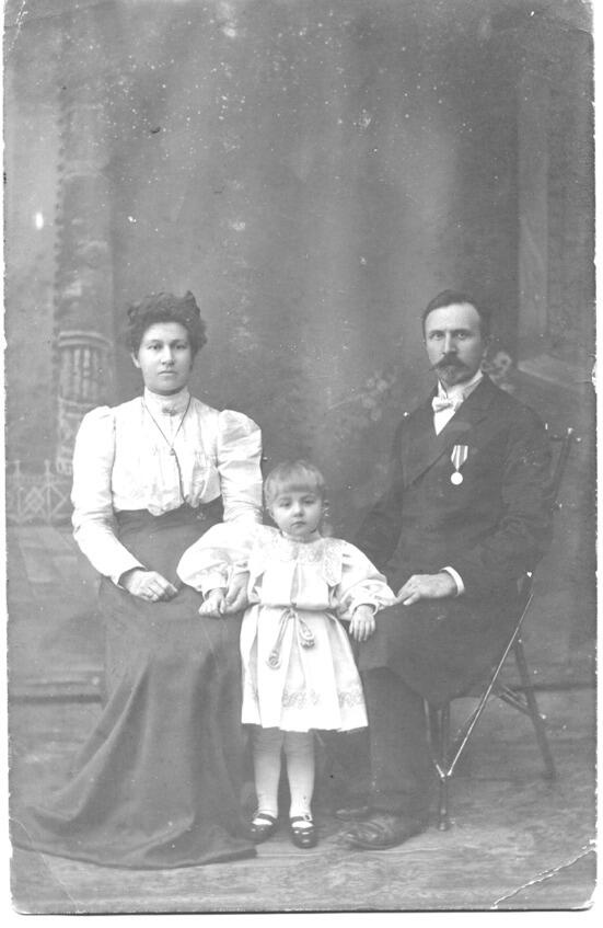 Платанович Федор Иванович и его супруга Мария Даниловна Платанович и их дочь Саша Александра Федоровна, будущая мать Лили (Луизы) Платанович. Снимок произведен в Полоцке примерно в 1909 г.