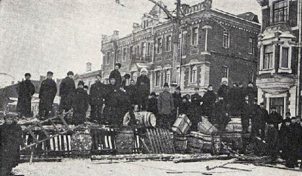 Barricade on Presnya Street (now Krasnaya Presnya), 1905, and its defenders. In addition to activists of the RSDLP (b) and left-wing Socialist Revolutionaries, militants of the Polish Socialist Party, the Finnish Party of Active Resistance, the Socialist Jewish Peoples Party, the Bund, the Armenian Dashnaktsyutun, the Georgian National Democrats, the Latvian Forest Brothers, and many others, nominally Russian, participate in the fighting national socialist organizations