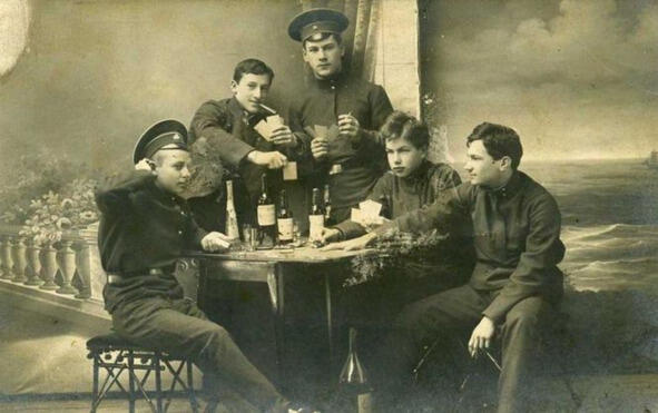 These Russian high-school students, with all the attributes of adulthood, are most likely not going to take the path of the revolutionary struggle. In the noisy hall of the restaurant. What is listening to our golden youth? Perhaps a romance performed by Nadezhda Plevitskaya The Seagull (1908)? Photo 1910 Надежда Плевикая, романс Чайка, слушать