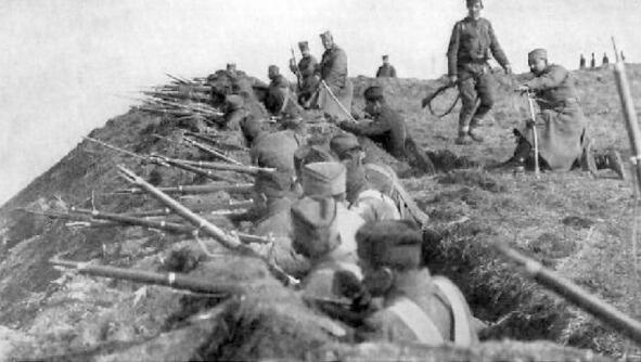 Since July 28, the Austro-Hungarian units have advanced some distance in Serbia, but already on August 19 they have suffered a crushing defeat. The second, more powerful wave of the Austrian offensive, November 30, 1914, overwhelms Belgrade. Ammunition and foodstuffs from France and Russia allow the capital to be liberated by December 15, 1914. The front stabilizes at the frontier of the Sava and Drina rivers. In total, by this time the Austro-Hungarian Empire was losing 28,000 people killed, 46,000 prisoners, Serbia 22,000 permanently, 19,000 prisoners. In the photo the Serbian soldiers in the trenches. Neighborhood Kolubar, November 16, 1914