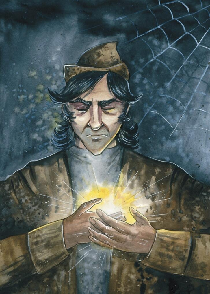 И вот однажды вечером огня не нашлось, осталась лишь маленькая, почти незаметная искра. Человек наблюдал её с удивлением. Тогда он взял эту искру и поместил в своё сердце. Ведь без огня он не смог бы плести жизнь дальше. Прошло несколько мгновений, а может, веков, без отдыха. Ранним утром Мизгирь понял, что без перерыва ему стало очень тяжело прясть. Он остановился, лес замер. Превратившись в человека, творец жизни пошёл к камню, где когда-то давно его всегда ждал огонь. Возле камня, он встретил крысу. Она принесла волшебный хворост и рассказала, что силы света послали её к камню. Мизгирь достал искру, соединив её с хворостом, и пламя вновь разгорелось.