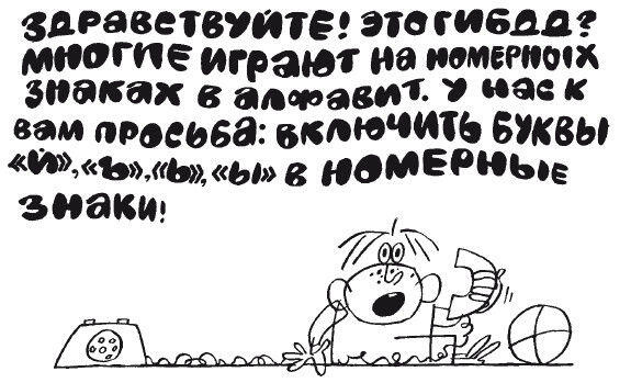 Но только не для нас. Ведь мы с вами займемся в это время одной очень интересной игрой. Что делать, когда вокруг одни автомобили? Конечно, составлять фразы из букв на номерных знаках (каждое слово во фразе должно начинаться именно с этой буквы). Например, одному достался номер «ЛВС». Он придумал: «Лови бешеную свинью». А другому «СКП»: «Смотри, корова полетела».