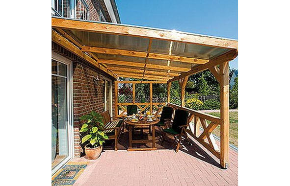 Все элементы конструкции этого навеса к частному дому, изготавливаемого своими руками, выполнены из дерева. Исключение составляют только металлические уголки, но если задаться целью, их можно заменить деревянными кубиками-накладками. Впрочем, без шурупов все равно не обойтись.