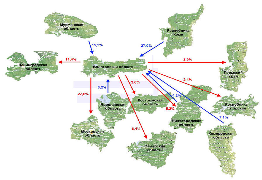 Важное влияние на развитие экономики Вологодской области оказывают также межрегиональные миграционные связи. В последние годы наблюдался отрицательный миграционный прирост, сформированный за счет убыли населения вследствие межрегиональной миграции. В результате нее за 20052009 гг. население области снизилось на 1800 чел., причем в кризисном 2009 г. на 548 чел. (худший показатель за последние годы). [1]