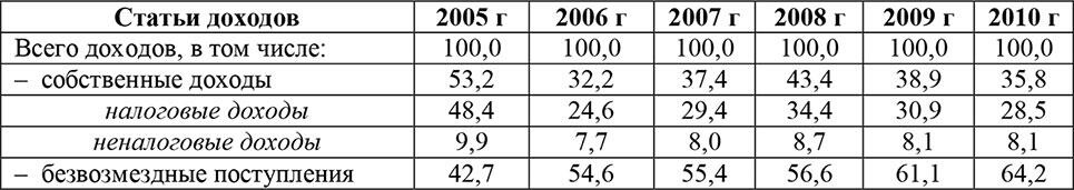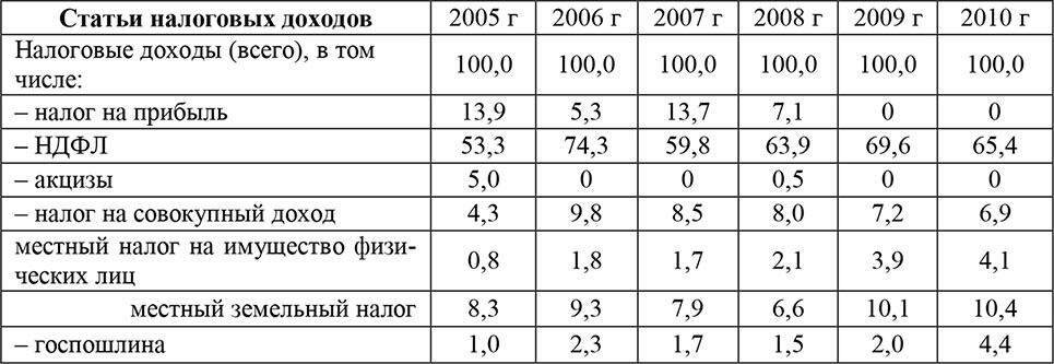 Из таблицы видно, что в дореформенном 2005 году весовые значения налогов отличаются от последующих лет. Так, в частности, на нет сошла роль налога на прибыль и акцизов в формировании местных бюджетов. Большая доля доходов в исследуемом периоде приходилась на налог на доходы физических лиц. Но поскольку он является федеральным, поступления в местный бюджет осуществляются не в полном объёме. Местные имущественные налоги не дают муниципальной казне ощутимую поддержку (от 8,7 до 14 % в исследуемом периоде). Такая налоговая структура бюджета не в силах обеспечить его сбалансированность и экономический рост территорий.