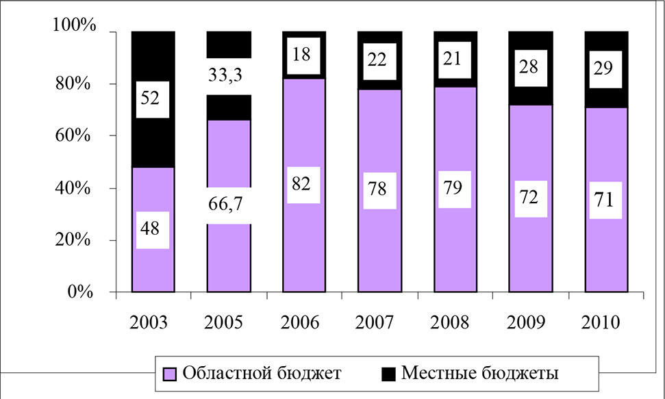 Данные таблицы позволяют сделать представление о доле самостоятельности и самодостаточности местных бюджетов области до реформы (в 2005 г. 53,2 % собственных источников в общей суме доходов) и после (самый высокий показатель совокупной доли налоговых и неналоговых источников наблюдался в 2008 г., составляя всего 43,4 %).