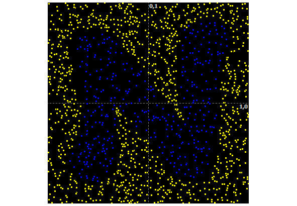 Программа реализует нейронную сеть типа многослойного перцептрона, предназначенную для классификации 2D-точек в два различных класса, жёлтый и синий. Каждое множество 2D-точек представляет собой геометрическую фигуру (форму) круг, квадрат, бриллиант, волну, луну или другую фигуру.