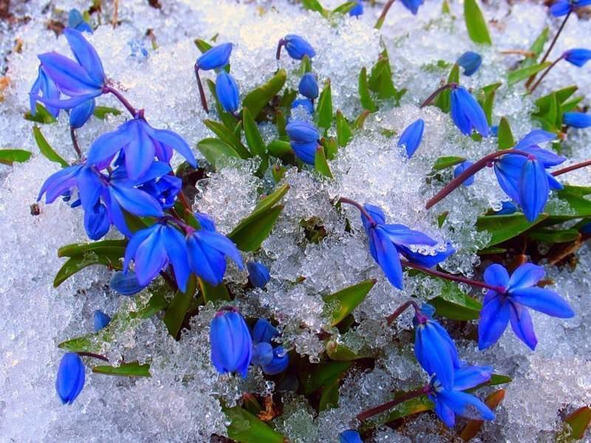 Много ярко-голубых маленьких подснежников.