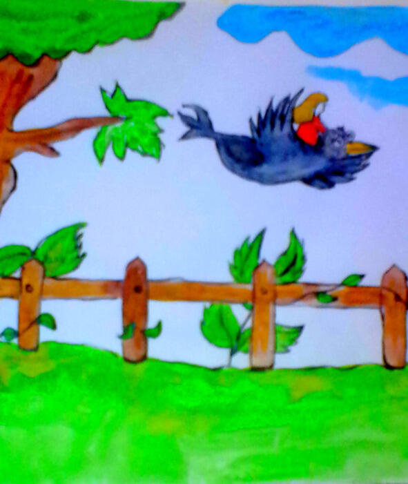 Сидит как-то Ириска на лавочке, смотрит по сторонам, скучно ей Как ей надоела такая жизнь, вот бы убежать отсюда, но кругом высокие заборы, не убежишь На большое дерево, стоящее возле лавочки, сели две огромные чёрные птицы, одна птица слетела с дерева и начала усиленно искать что-то съедобное на земле, Ириска вспомнила, что в её карманчике платья были крошки от печенья, Ириска высыпала эти крошки на землю прямо возле лавочки, птица начала их клевать, а Ириска ловко спрыгнула на спину птицы и ухватилась крепко за перо птицы, «Кар!», крикнула птица и взлетела, «Это ворона!» подумала Ириска, но вторая птица поменьше пыталась клюнуть девочку, сбросить её с большой вороны. Вороны полетели быстро-быстро Было страшно Ириске, она спряталась в перья вороны и притихла.