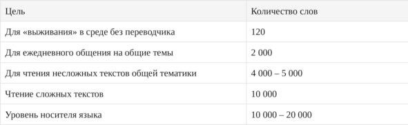 Количество слов, которое необходимо знать для следующих целей использования иностранного языка