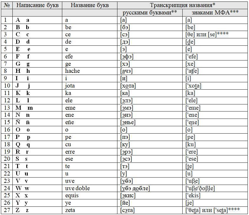 Испанский алфавит (abecedario или alfabeto español) базируется на латинском алфавите и на сегодняшний день содержит 27 букв: