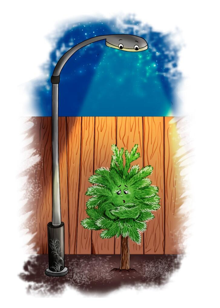 Холодало. Серые тучи, беременные снегом, жаждали разродиться. Высокие заборы обступали Ёлочку и словно душили всё вокруг. Ночь молчала. Неуклюжий фонарь склонился над пушистым деревцем, чтобы согреть его единственной лампочкой. Но Ёлочка не чувствовала тепла. Она замерзала. «Где же Ваня? С ним что-то случилось!» думала Ёлочка чуть не плача.