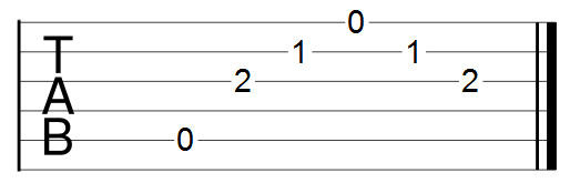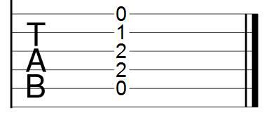 Строение каждого из романсов довольно просто́. Верхний нотоносец это основная партия шестиструнной гитары. Сразу под ним находится табулатура, т.е. упрощённая запись той же самой гитарной партии. Третий нотоносец и табулатура под ним это мелодическая линия романса, записанная тоже для гитары. И всё это объединено в одну группу. Над нотами я написал аккорды, на которых строится исполнение того или иного такта. Аппликатуры этих аккордов помещены сверху над каждым из романсов. Теперь что касается непосредственно табулатуры. Табулатура это шесть горизонтальных линий, разделённых на такты. Внутри каждого такта на какой-либо из линий стоят цифры. Горизонтальные линии это струны гитары. Нижняя линия это шестая струна; верхняя, соответственно, первая струна. Каждая из цифр на струне это номер лада, на котором эту струну следует зажать. Например, всем известный аккорд Am (Ля минор) в табулатурном обозначении будет выглядеть так: