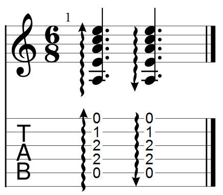 Волнистые стрелки рядом с нотами обозначают, что нужно провести по струнам в данной позиции сверху вниз или снизу вверх: