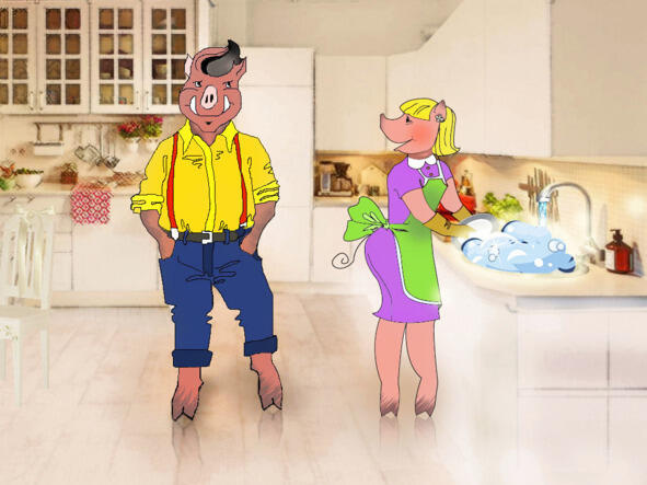 В работе всегда и во всем ему помогает жена, которую зовут тётя Хрю. Без неё Свин Свинычу было бы нелегко.