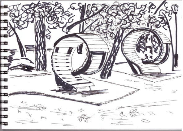 Если идти к Волге по Полевой, то мы увидим с левой стороны, скверик с обновленными лавочками и странными инсталляциями, отдаленно напоминающими салон трамвая.
