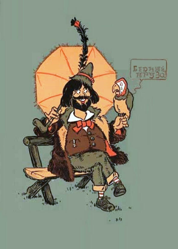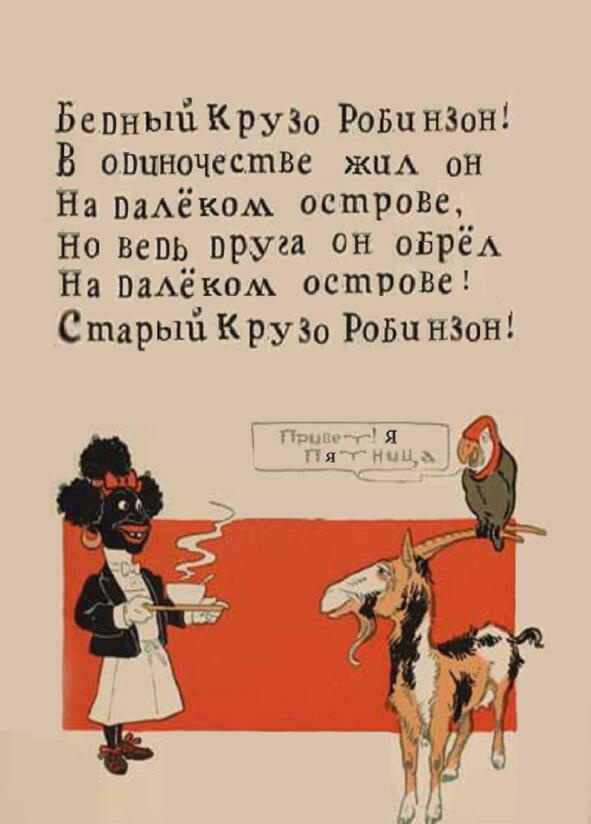 Poor old Robinson Crusoe! Poor old Robinson Crusoe! They made him a coatOf an old nanny goatI wonder how they could do so! With a ring-a-ting tang, And a ring-a-ting tang, Poor old Robinson Crusoe!