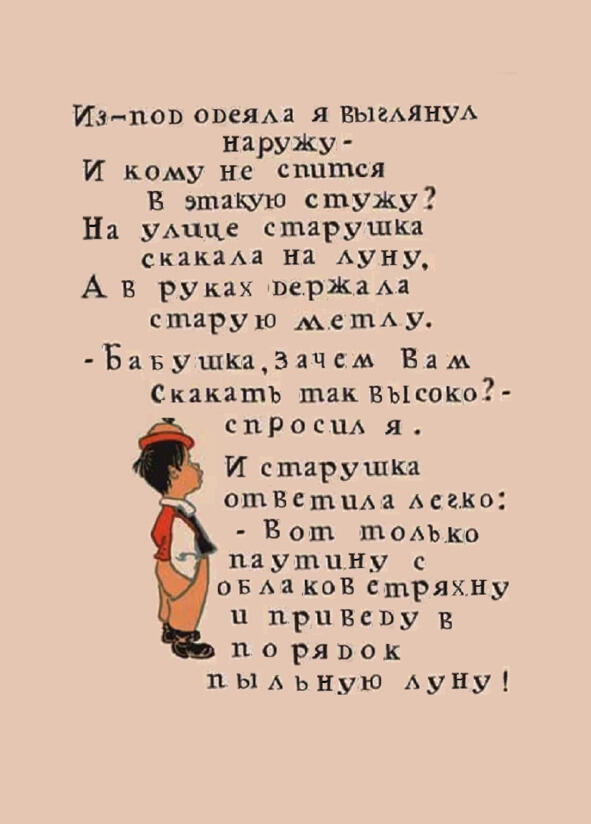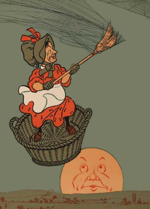 There was an old woman tossed up in a basketNineteen times as high as the moon; Where she was going I couldnt but ask it, For in her hand she carried a broom. Old woman, old woman, old woman, quoth I,O whither, O whither, O whither so high? To brush the cobwebs off the sky! Shall I go with thee? Aye, by-and bye!