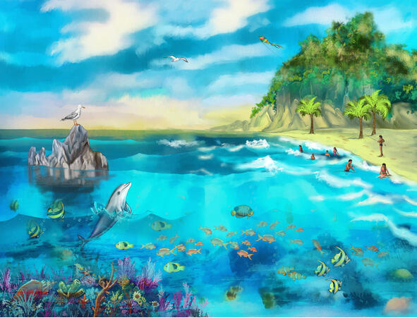 Всплыв наверх из морской глубины, малыш увидел перед собой очень красивую гавань с ослепительно-белым песчаным берегом, посреди которого росли пальмы. На пляже лежали необычные существа, которых он никогда раньше не видел. Они вставали со своих мест и шли в море купаться, а Фанни долго рассматривал их, пытаясь понять, как следует себя с ними вести.