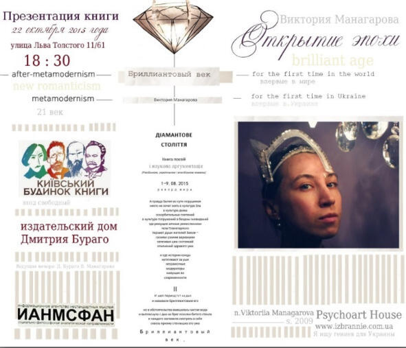 22 октября 2015 года в Киевском доме Книги мы вместе с Аглаей отворили двери в новую эпоху «Без зла» в структуре философской парадигмы пост метамодернизма6 для нового поколения детей, которые, несомненно, заслуживают счастливой жизни в мире без войны и без страданий. Конечно, Леди Аха (Хамелеон) позаботилась об этом