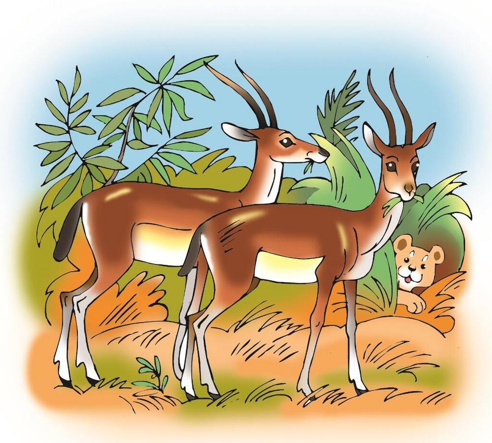 Задание 3Охота на АнтилопЗалёг Лев со Львятами недалеко от стада Антилоп. Неопытным Львятам не терпится напасть на них, но Лев их сдерживает.
