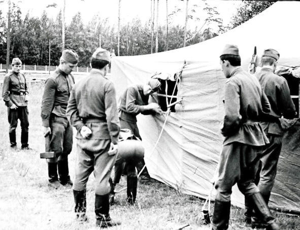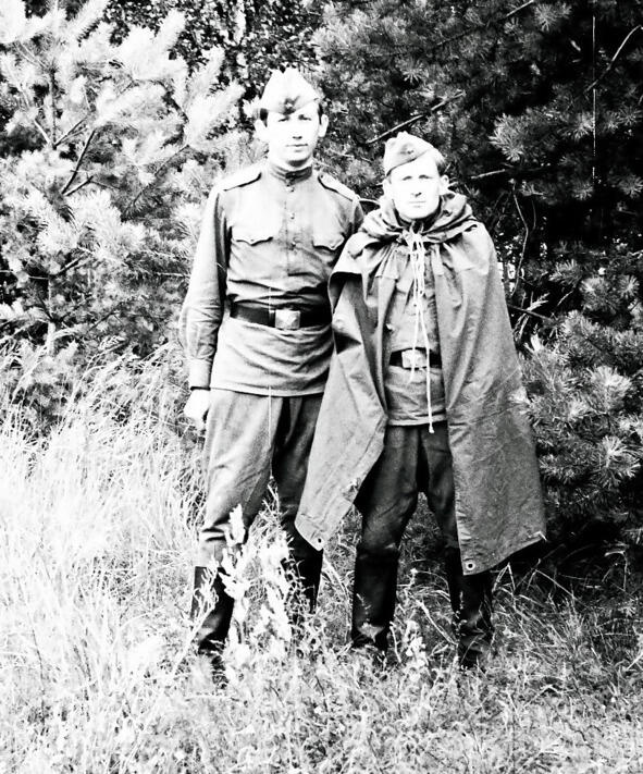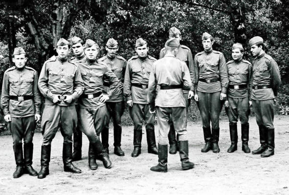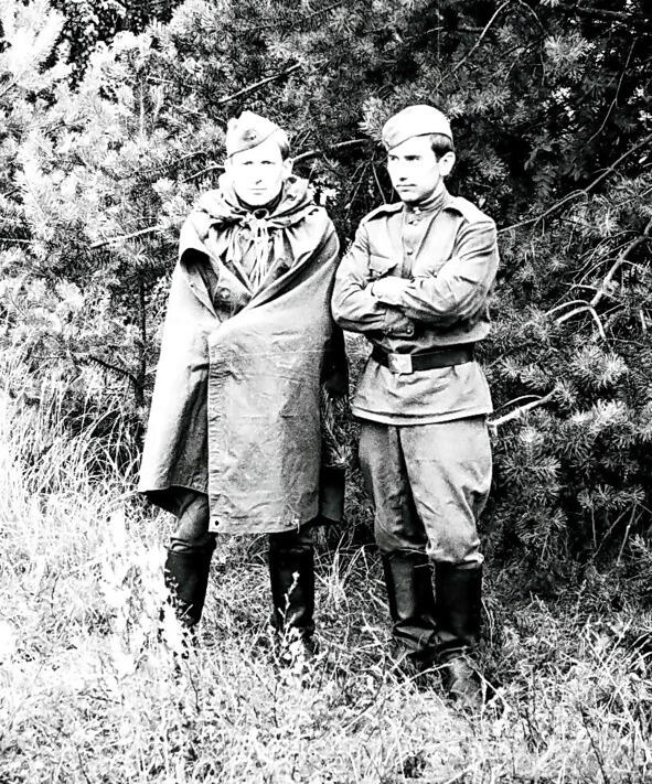 В институте была обширная и суровая военная кафедра, которая занималась подготовкой мужской половины студенческого корпуса навыкам оказания медицинской помощи в условиях военного времени. Тщательно прорабатывались темы применения противником оружия массового поражения: ядерного, химического, бактериологического. На картах развертывали медицинские батальоны, госпитали, медицинские базы После пятого курса на базе одного из десантных полков ежегодно проходили летние сборы, на которых своим слушателям преподаватели в погонах старались в полной мере показать все «прелести» армейской службы. Для этого привлекались действующие офицеры и сержанты части. Во время сборов было много занятий по строевой подготовке, мы неоднократно сдавали физические нормативы, несколько раз нас неожиданно поднимали по тревоге с зачетом по времени. Тренировки по стрельбе проходили в специально оборудованном в лесу тире. На обратном пути я сделал несколько снимков моих друзей.