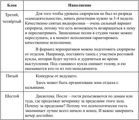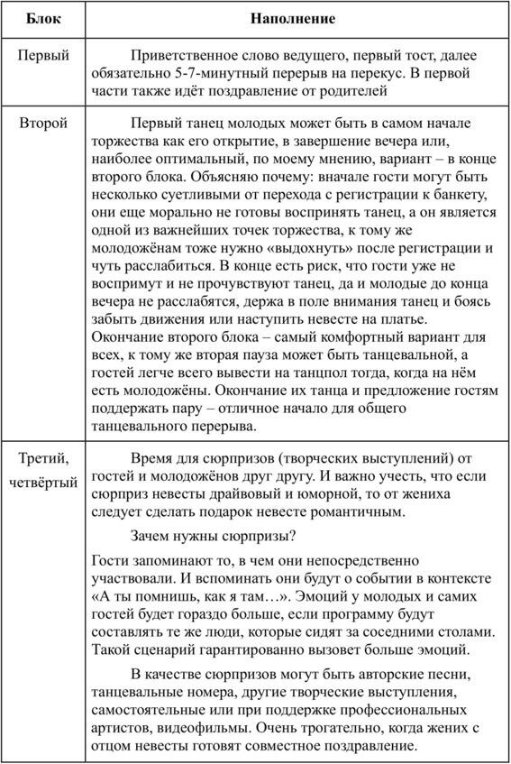 Принцип построения программы простой: эмоционально мы гостей держим в некотором напряжении, чередуя слезоточивый и трогательный момент с ярким и весёлым. Доводим до кульминации в четвёртом блоке, затем чуточку приспускаем эмоции в пятом, даём время для свободного общения и танцев и отпускаем домой, чтобы у гостей осталось ощущение лёгкой недосказанности и послевкусия: «Всё было так прекрасно, жаль, что так мало времени, хотелось продолжить».