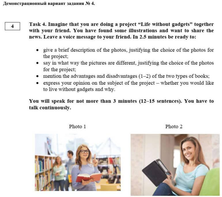 Задание 4-го раздела «Говорение» является заданием высокого уровня сложности. Это тематическое монологическое высказывание с элементами рассуждения обоснование выбора двух фотографий-иллюстраций к проектной работе на определенную тему и выражение своего мнения о теме проекта. Экзаменуемому предлагается следующая ситуация: он вместе с другом выполняет проектную работу и нашел две фотографии по теме проекта, которые можно использовать как иллюстрации. Участнику экзамена нужно записать голосовое сообщение другу, представив две фотографии в рамках заданной проектной работы.