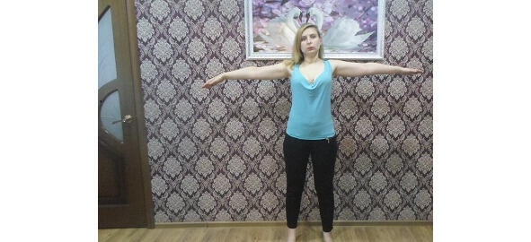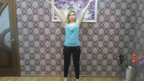 Для выполнения этого упражнения потребуется. Прямо поставить стопы на ширине плеч, чтобы избежать выворота суставов. Чуть чуть расслабляем колени, чтобы предотвратить артрит. Поджимаем попу, особенно это говориться для женщин, чтобы уменьшить впадину в пояснице, которая зачастую приводит к ее болезни, прострелам и многим другим. Подтягиваем животик, чтобы мышцы научились быть в тонусе, что очень важно для стройности. С выдохом выпрямляем спину, вспоминая, что мы все таки человек прямоходящий. Далее ставим правильно шею, обычно мы ходим и сидим, ее немного наклонив, что приводит к ее защемлению и появлению боли, и появлению также горбинки между шеей и плечами. Ровно ставим голову, чтобы правильно ловить энергию космоса