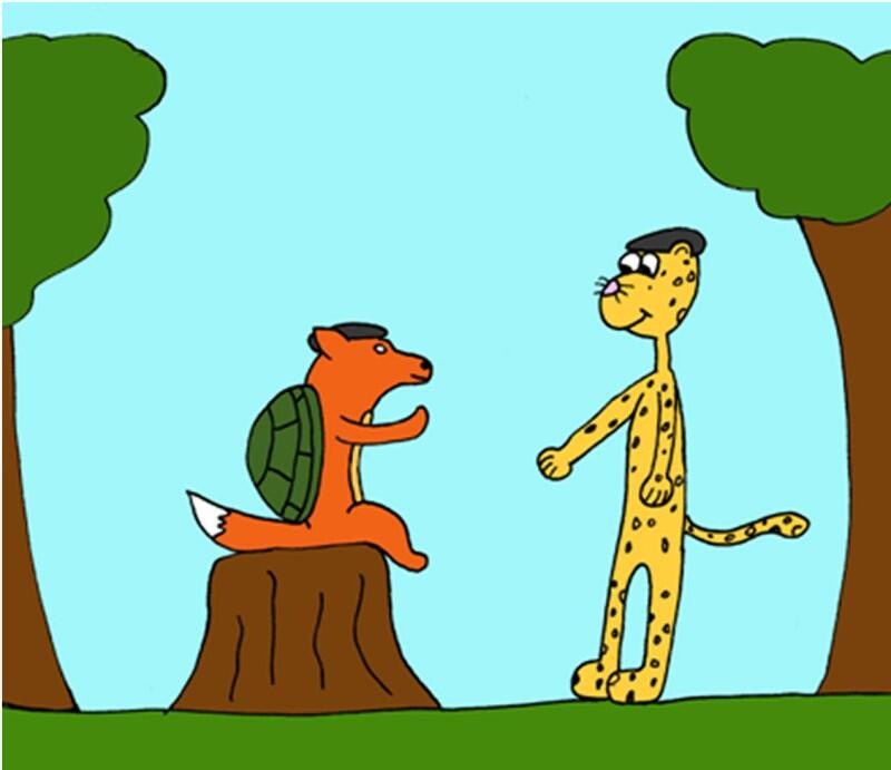 »Mein lieber Freund Leopard, ich will dir einen Gefallen tun, der dich noch berühmter als König Löwe machen wird. Ich werde deine Jungen mit wunderschönen Flecken verzieren, wie sie noch nie jemand gesehen hat. Und wenn ich fertig damit bin sie anzumalen, werden alle Tiere von Dschungelstadt endlich einsehen, dass König Löwe dir nicht ebenbürtig ist. Schließlich werden alle in Dschungelstadt zusammenkommen und dich anstatt dem Löwen zum König machen. Und sie werden vor dir auf die Knie fallen und rufen: Heil dir, König Leopard!«