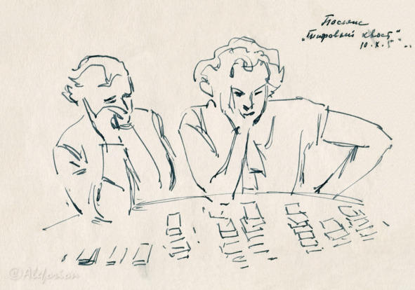 «Пасьянс Тигровый хвост», бумага, чернила, 19 х 13 см. На наброске Алексей изобразил Ольгу Дмитриевну и Дим Димыча, углубившихся в «игру со случаем».