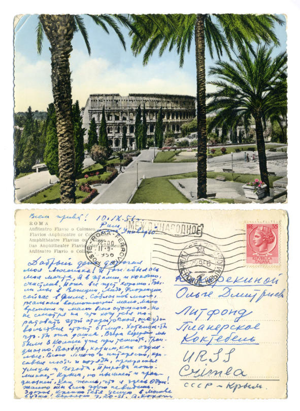 Открытка, отправленная Алексеем из Рима в пансионат Литфонда в Планерском, (Коктебель, Крым).