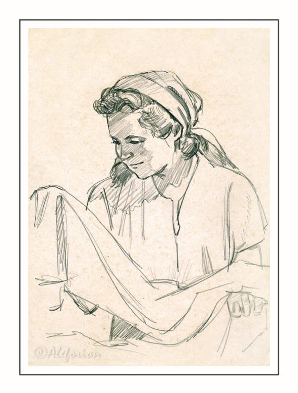 Набросок «Женщина рассматривает отрез ткани», бумага, карандаш, 20 х 29 см.