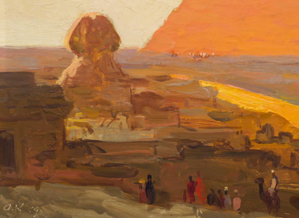 Фрагмент работы « Пейзаж с пирамидой Хеопса и Сфинксом», в левом нижнем углу хорошо видна подпись художника «А. К. 59»