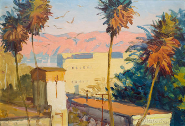 «Вид на Нил из окна гостиничного номера», А. Кокорекин, картон, масло, 50 х 35 см, 1959 г., «Египетская трилогия».