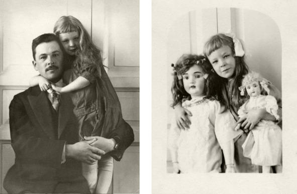 Слева: Ольга с отцом, Дмитрием Дмитриевичем Капшаниновым, приблизительно 19161919 г., справа: маленькая Ольга с куклами, приблизительно 19161919 гг. прошлого века.