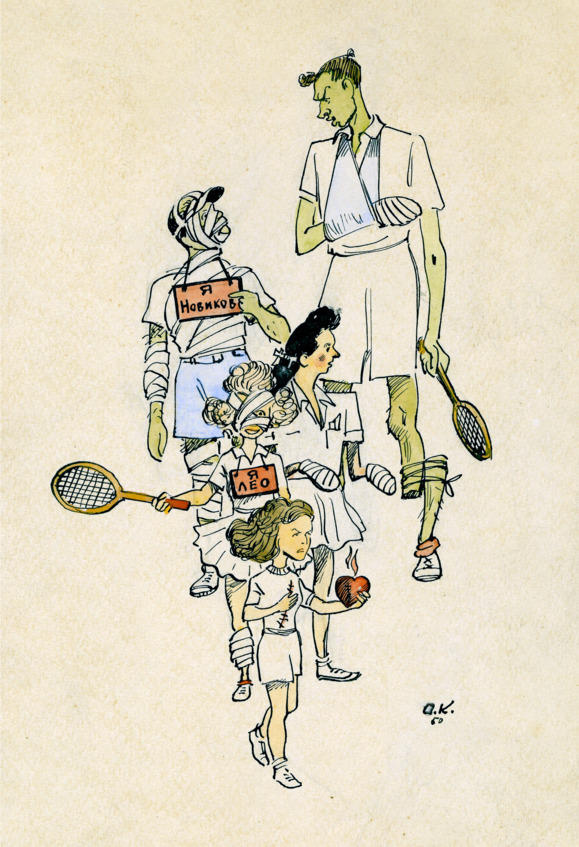 На другом дружеском шарже подпись «Корбут Женя» тоже фигура известная: тренер, пионер отечественного тенниса. Есть коллективный шарж на группу покалеченных игроков, датированный 1950 годом. Замыкает шествие Евгений Корбут, а возглавляет Ольга Капшанинова, несущая в руке своё пламенеющее заштопанное сердце. Называется работа «После матча».