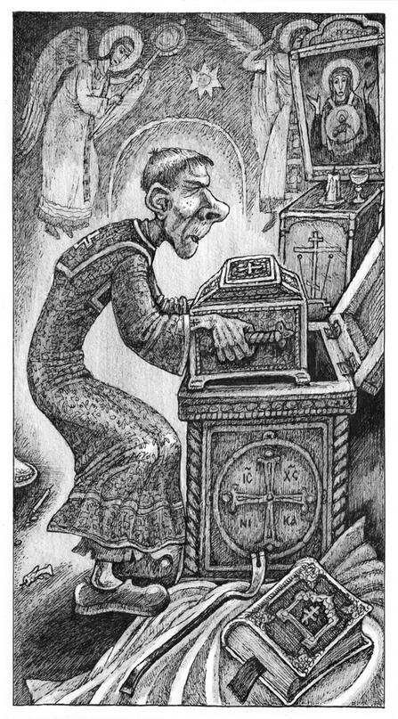 Феофил не отвлекался, вылупившись на святые останки. Сухая ручка машинально трогала нагрудной крест. Сильные чувства парализуют нервную систему и она перестаёт реагировать на внешние импульсы, варясь сама в себе.