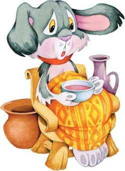 Зайчиха усадила мужа в кресло, укутала лапы теплым покрывалом и подала чашку горячего чая с малиновым цветом.