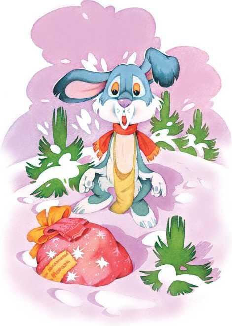 Это подарки к Новому году! воскликнул зайка. Значит, это не лесник, а Дед Мороз мешок потерял. Как же быть? Теперь малыши останутся без подарков? Доставлю-ка я их сам. Адреса тут все указаны. Нужно выручать Деда Мороза.