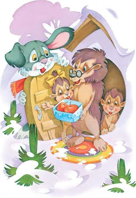 С наступающим Новым годом! сказал зайка. Здравствуй, соседка, кивнул он хозяйке. Я к вам не в гости, а по важному делу посылку принес с подарками, и он протянул нарядную коробочку Ежу.