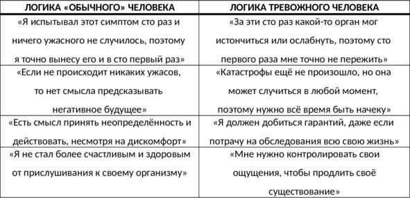 Чем раньше вы поймёте, что всё то время, которое вы ежедневно тратите на несбывающиеся катастрофические прогнозы, вы можете, как выясняется, жить спокойно, тем скорее ваши телесные симптомы будут проходить и тем меньше вы будете жалеть о напрасно потраченном времени на бесконечные обследования и анализы. Поэтому в отношении своего здоровья полезнее придерживаться принципа золотой середины между медицинскими фактами (результатами инструментальных методов обследования, которые доказывают, что ваш организм здоров, хотя и не гарантируют, что с ним ничего и никогда не случится) и тревожными домыслами и фантазиями («У меня рак!», «Я болею СПИДом!», «Мои органы истрепались!», «Я неизлечимо болен!», «Я схожу с ума!» и т.д.). Стоит отказаться от нереалистичного и не помогающего вам восприятия своего организма как идеально сконструированного и безупречно работающего механизма и осознать, что в жизни нет никаких гарантий, однако попытки их получить ведут к избыточному контролю, не создающему ничего, кроме лишнего напряжения и повышенной тревоги. Весьма наглядные примеры искажённой логики тревожного человека в отношении своего здоровья приводятся в расположенной ниже таблице (см. таб. 5).