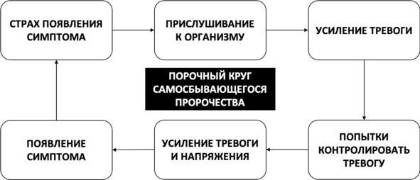Так работает порочный механизм самосбывающегося пророчества: вы прислушиваетесь к своему состоянию, боясь появления симптома, что ведёт к усилению тревоги, в ответ на что вы начинаете контролировать свою тревогу с целью предотвращения возникновения симптома, что только усиливает напряжение и тревогу и в итоге приводит к тому, чего вы больше всего боитесь появлению симптома (см. рис. 15). Выход из этого порочного заключается в том, чтобы перестать ежедневно прислушиваться к своему самочувствию, отпустив контроль над тем, что вы контролировать априори не в состоянии, и чаще спрашивать себя: «Как мне помогает прислушивание к себе?», «Стал ли я от этого более здоровым и счастливым?», «Что будет происходить, если я продолжу это делать?»