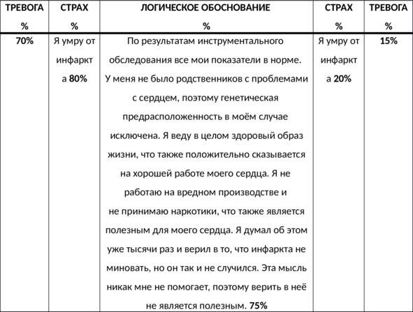 Действие 3. Логически обоснуйте свой страх за здоровье, включив в это обоснование как можно больше фактов и доказательств, опровергающих ваши тревожные предсказания и фантазии, а также оцените степень доверия к логическому обоснованию в процентах.