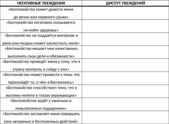 Примерами негативных убеждений о беспокойстве могут служить следующие верования: