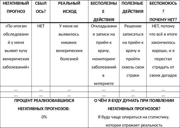 Чтобы прояснить для себя реальное положение дел и осознать, как часто вы обесцениваете или попросту забываете опыт несбывшихся прогнозов в сфере здоровья, вам будет крайне полезно составить таблицу прошлых беспокойств о здоровье, для чего вы можете совершить несколько простых действий. Пример заполнения таблицы представлен ниже (см. таб. 12), а чистая форма для самостоятельного заполнения в Приложении 6 в конце книги.