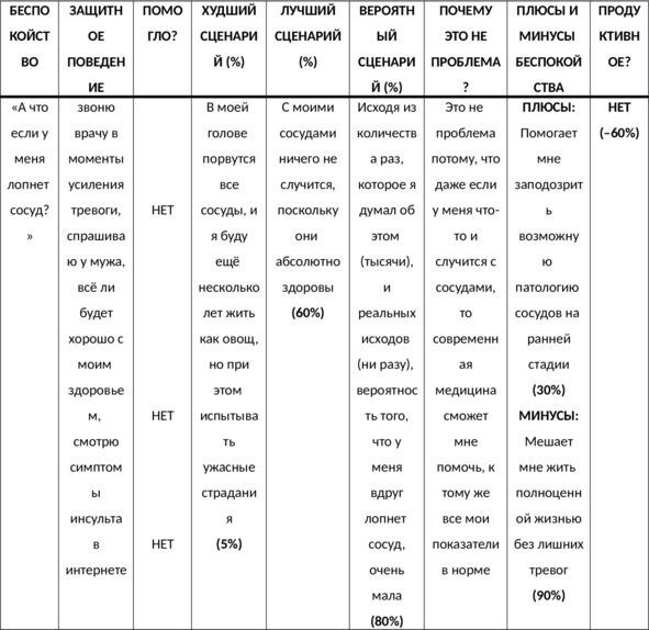 Составив таблицу своих текущих переживаний о здоровье, вы можете вычленить из неё свойственные вам варианты защитного поведения, которые вы обычно совершаете, чтобы получить облегчение и успокоение во время наплыв ипохондрических мыслей, но которые лишь подпитывают вашу привычку беспокоиться в долгосрочной перспективе. Защитное поведение это действия, которые вы совершаете в моменты тревоги, для того чтобы снизить её, приглушить чувство опасности или избежать дискомфортных ощущений. Важно понимать, что выполнение таких ритуальных и «спасительных» действий закрепляет в вашем сознании ложную ассоциативную связь: «ритуал сделан катастрофы не случилось» (как будто защитное поведение защищает вас и позволяет вам выживать). Итак, защитное поведение позволяет вам на короткий промежуток времени заглушить свою тревогу и притупить чувство опасности, но в долгосрочной перспективе только усиливает тревогу и ощущение опасности.